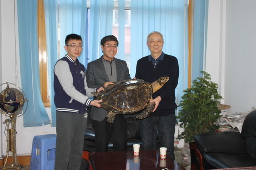3月30日下午,公道中学首届高中毕业生——68届校友顾如鑫携子(公道中学届2008届校友顾晟楠)来到公道中学访问,在学校的校长室顾氏父子将自己家里珍藏了二十多年的一个玳瑁标本捐献给学校,表现了父子两代人对公道中学一片浓厚的学子情。公道中学沈文涛校长、汤恒锦副校长等与顾氏父子进行了亲切交流,并对顾氏父子表示感谢。此玳瑁标本具有一定的收藏价值,学校待新实验楼落成以后,将此存放在生物标本室,以供学校教学、科普等活动使用。