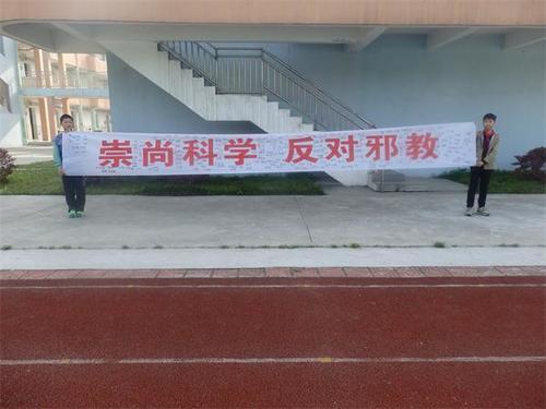 学生代表和教师代表集体在“反对邪教 崇尚科学”条幅上签名。学校发放了告家长书,宣传邪教的危害;通过国旗下讲话、班队主题课、黑板报等手段,继续加大宣传力度,教育全体师生要远离邪教、珍爱生命。