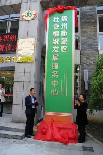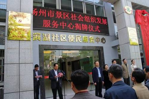 2016年4月22日上午,滨湖社区彩旗飘扬、锣鼓喧嚣、爆竹阵阵,市区两级领导莅临为位于滨湖社区三楼的社会组织发展服务中心揭牌,出席揭牌仪式的领导有:扬州市民政局局长张莉、副局长王正祥,景区党工委书记张福堂、副主任周长军、办公室主任吴文志、社会保障处处长李家奎及各乡(街道)主要领导。揭牌仪式由景区办公室主任吴文志主持,李处长、周主任、王局长分别致辞讲话。