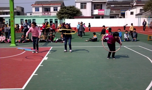 下午1:30分,趣味运动会在杨庄小学新建的塑胶田径场进行。此次运动会共设1分钟转呼啦圈、呼啦圈翻圈跳、立定跳远、定点投篮、篮球运球过障碍、30米往返接力跑、30米两人三足往返跑、乒乓球拍托球往返跑、滚铁环等9个项目。所有项目取前三名,计入班级总分,评出优胜班级。