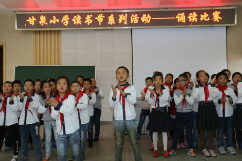 为了弘扬中华传统文化,从经典中汲取文化精髓,让书香弥漫整个校园,浸润孩子心灵。5月5日,甘泉小学举行了读书节系列活动----低年级诵读比赛。