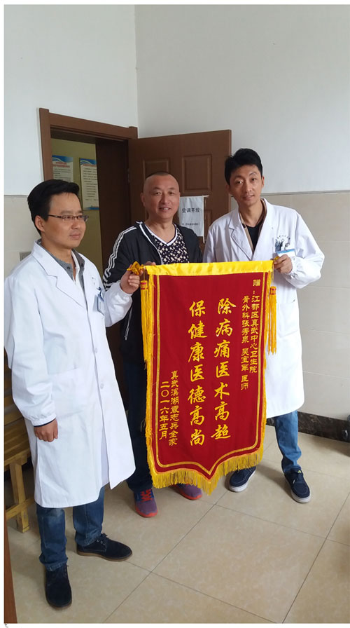 没有锣鼓喧天,没有鞭炮齐鸣,2016年5月9日上午8:00时许,一位病人家属满脸笑容,给我院外科送来代表全家的感谢,一面鲜红的锦旗,感谢之情难于言表,上面写有14个金色的字样:“除病痛医术高超 保健康医德高尚”,真武滨湖袁志兵全家赠给真武中心卫生院张秀泉、吴宝军医生。事情还得从三日前说起,一位82岁的老太叫郭中英,一年前患脑梗塞,5月5日下午自己不慎跌倒致伤左髋部,患者当时自觉局部疼痛剧烈,不能活动,被家人抬入我院,接诊医生是张秀泉医师,张医师为患者进行认真的体格检查,考虑“左股骨粗隆间骨折”,为进一步确诊需要摄片检查,张医师主动协助家属将患者抬入放射科,摄片提示:“左股骨粗隆间粉碎性骨折”,难题出来了,患者年高,又合并脑梗塞,需要手术,风险非常高,征求家属意见,转院患者及家属不愿意,病人动弹不得,很不方便,又会给患者增加痛苦,有十几年临床经验、刚在苏北医院进修过骨科的吴宝军医师知道病人情况后,就和张医师会诊,商量决定,完善各项辅助检查,积极认真术前准备,5月7日上午星期六,他们放弃休息,为患者施行手术,手术名称是:“DHS股骨粗隆间切开复位内固定术”,整个术程由于患者年高,麻醉很难打阻滞不全,给手术带来困难,加之疼痛导致血压升高,他们只好暂停手术,用药调整血压,麻醉师加强麻醉效果,吴医师和张医师术中高度集中,配合默契,约一小时余手术顺利成功。家属高兴地对二位医生说;“想不到在家门口也能解决这么大的难题,小医院的医生医术同样很高”。