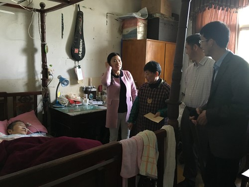 徐桂兰是新村庄新村居民,瘫痪在床多年,生活无法自理,紧靠流食和药物维持生命,生活困难。在徐桂兰家中,刁进文和孔理询问了她的生活和身体等情况,鼓励她要树立自信、自强的生活信念,积极乐观地面对困难。