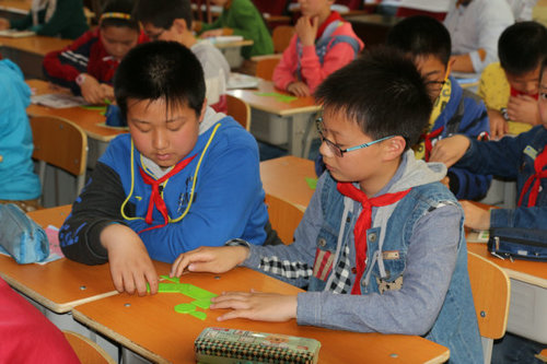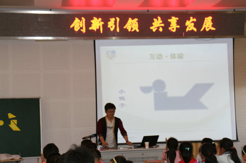 薛老师通过“赛制简介、基本图形、图形变化、成果展示” 几部分的讲解,让学生和辅导员了解了七巧科技的比赛规则和活动过程。薛老师对七巧板拼图的设计与创造、一图多拼、多幅组合等进行了生动活泼的讲解,并运用多媒体技术生动的展示各种动物、飞机、人物、体育运动、古诗意境等智力七巧板拼图,激发了听众的浓厚兴趣。