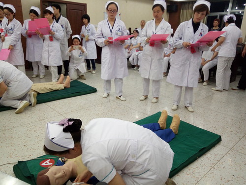 挑灯夜训,只为技能更精、技术更优。身着护士服、头戴燕帽的“天使”们正分队赛的热气腾腾。20人分成两组,8名评委。参赛护士迅速检查病人是否有意识、是否有颈动脉搏动和呼吸,记录急救时间,进行胸外心脏按压,清理病人口中异物,口对口进行人工呼吸,病人意识恢复,直至电子示教人宣布“复苏成功”。担任现场总监的陈永和院长频频点头赞许。