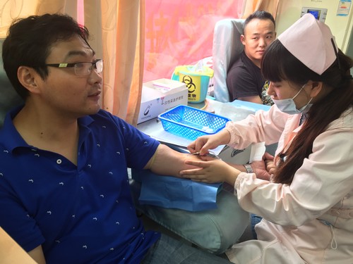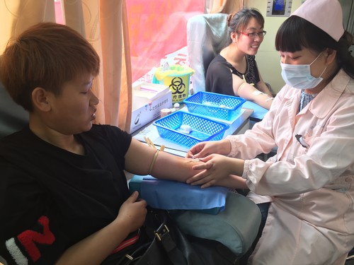 活动中,大家通过填表、检测、采血,大家按照医生的要求秩序井然地进行着。采血车上,那些血袋像一团团鲜红的爱心,温暖如春。社区残疾人袁旭在得知此次活动时间、地点后,主动来到献血现场,但在检测血压时,也可能第一次献血,感觉紧张,接连检测血压两次都被医生告知心率过高,不适宜献血。袁旭不灰心,在现场继续等待,终于在第三次检测时,心率达到了正常值,他高兴的走上献血车。在采血过程袁旭很兴奋的说:今天是我的生日,我觉得生日这一天献血是觉得很有意义,希望能够带动更多的志愿者,参与到这个队伍中来。