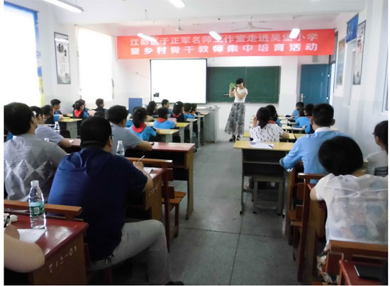 6月15日下午,江都区于正军名师工作室暨乡村小学数学骨干教师培训班的全体成员一行30余人,走进小纪镇吴堡小学开展了课堂教学研讨活动。吴堡小学沈雅静、高徐小学蒋晓勇两位老师分别执教的五年级数学上册《认识公顷》、《解决问题的策略》,都注重调动学生的生活经验,循循善诱,构筑了儿童的数学乐园。研讨会上大家畅所欲言,认真探究:两位教者分别介绍了运用“数学生活化,生活数学化”“儿童本位,自主学习”的教学理念精心备课的基本情况;几位市级小学数学学科带头人都从不同的角度对两节课作了居高临下的点评;于正军老师就《如何构建数量单位表象》《区分解题的方法与策略》作了精辟的指导。活动让吴堡小学的数学老师得到了培训与提高。