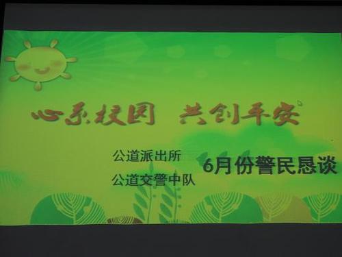 6月16日上午,公道派出所组织民警在公道中心小学礼堂,召开了由全体师生参加的以“心系校园,共创平安”为主题的警民恳谈会,会上民警向与会师生汇报了近期派出所工作情况,认真听取了意见建议,耐心了解群众需求,同时就如何进一步有效防范网络电信诈骗、安全出行、增强防控意识防范恐怖袭击、防范“两抢一盗”、防夏季溺水事故等进行较为系统地讲解,极大地提高了与会人员的防范意识,且通过他们扩大宣传覆盖面,全面增强恳谈效应;期间演讲民警还与学生们进行有奖问答互动,进一步增强了恳谈氛围和效果。师生代表提出了加强校园周边环境治理、加强交通管理压防交通事故的两点工作意见,恳谈民警现场初步予以答复。公道交警中队参加了座谈。