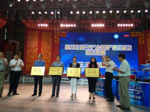 6月24日下午,在扬州市应急办、民政局、地震局等部门联合举办的2016年扬州市“人保杯”防灾减灾知识竞赛中,我区代表队最终从参赛的9支市(县)队中脱颖而出,荣获竞赛一等奖,同时获得大赛优秀组织奖。(双救科)