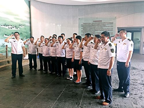 海事人员在瞻仰广场瞻仰了郭建光、阿庆嫂雕像和象征新四军伤员的18根柱雕,大家肃然起敬,纷纷赞叹新四军泰山压顶腰不弯的革命精神和军爱民民爱军的鱼水深情。沙家浜革命历史纪念馆内寂静无声,大家安静、有序的观瞻了400多幅革命历史照片和60余件革命文物,革命先烈不怕牺牲追求自由与和平的精神感染到了每一个人。最为振奋人心的是新时代新浜连战士抗洪抢险的画面,大家深受感动,因为见证了革命精神的传承——沙家浜精神永存!