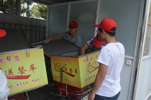 为了让老人们感到家人的温暖和社会的关爱。7月12日下午,虹桥社区联合扬州大学化学化工学院的八位同学组成一支志愿服务小分队,走进社区居家养老服务中心清洗爱心送餐车,志愿者们不放过任何一个死角,分成两个小组各自按着分工去做自己该做的事,先用钢丝球擦出少许铁锈,然后再用抹布抹两遍,大家不仅是做些清洁工作而已,更多的是带着“老吾老以及人之老”这样的心情在服务。
