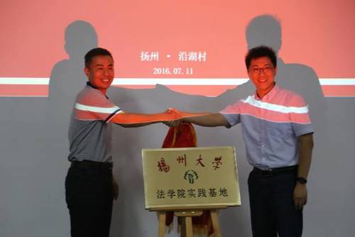 随后,扬州大学法学院党委副书记花瑞锋发表讲话,对于村镇领导的大力支持表示感谢:“感谢沿湖村各位领导的热情接待,同时也感谢你们为我们‘三下乡’实践团队提供各方面的条件,支持他们更好地去完成‘乡贤’的调研。”沿湖村作为“邵伯湖畔的世外桃源,其巨大的发展转变中有着典型的“乡贤”文化,这正好符合我们调研的方向。社会是“第二课堂”,对沿湖村“新乡贤”文化的探索不仅能让同学们学到课堂以外的知识,而且也能把自己所学到的知识应用到实践中来达到理论和实践相结合的目的。最后郎镇长与花书记共同为沿湖村成为扬州大学法学院实践基地的象征牌匾揭牌。