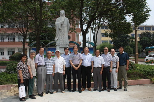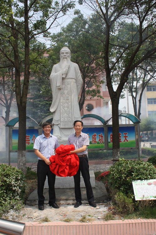 今年4月,扬州恒春公司董事长、74届校友蒋成玉得知母校正值建校六十周年,他专程来到母校访问,向母校捐赠了自己珍藏了多年的两件珍贵藏品——一件金丝楠木根雕和一件砗榘,以示祝贺母校建校六十周年!前些时候,蒋成玉到位于福建的全国雕塑之乡出差,因机缘巧合突与此尊“孔子塑像”,脑海中即刻闪现:以此放于母校公中校园内,极有教育价值意义。故毅然决断:虽与母校公中远隔千里之遥,也需将此请到母校,为母校增添人文光彩和育人气息,并让其成为公道中学校园美丽的一景。