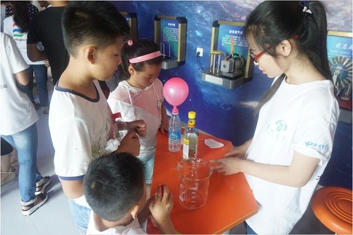 活动中,团队向武塘社区捐赠显微镜等实验仪器,院党委副书记王汉林和双桥街道党工委副书记许维共同为教育基地揭牌,随后,团队用麻袋背着试管、玻片、实验试剂、昆虫标本等为孩子们做了一系列的科普小实验,包括昆虫标本讲解与制作、色彩大变化、奇妙的吹气球、无字天书等部分。团队成员丁诗桐介绍道:“我们都是用简单的科学原理来给留守儿童们做有趣的小实验,比如‘奇妙的吹气球’就是利用醋和小苏打反应释放二氧化碳使气球膨胀,这些小实验可以引起他们对知识的渴望,提升他们对科学的认知,也可以培养他们的兴趣,为未来做好规划。”