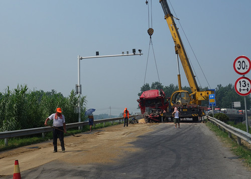事故发生后,高邮市公路路政大队第一时间赶赴现场勘验,迅速放置警示标志。由于油污面积较大,路面很滑,路政人员在烈日下引导车辆绕开行驶,并与三垛养护工区联系,下达处置公路特情指令,三垛工区调派5名养护工,用装载机运来2吨黄砂清除油污。当天上午事故发生所在地临泽气温最高时达40℃以上,太阳晒得路面发烫,站在这里不动也大汗淋漓,路政、养护人员冒着高温酷暑,奋战3个多小时,清除了路面油污,消除了安全隐患,公路恢复安全畅通。