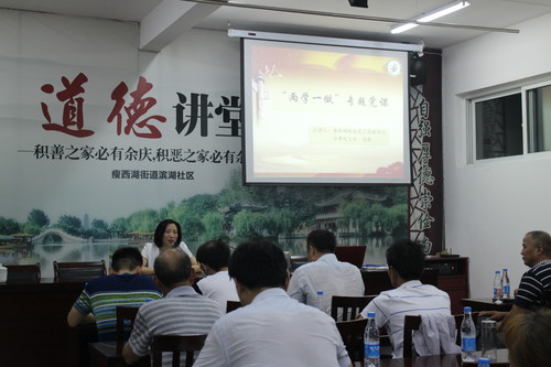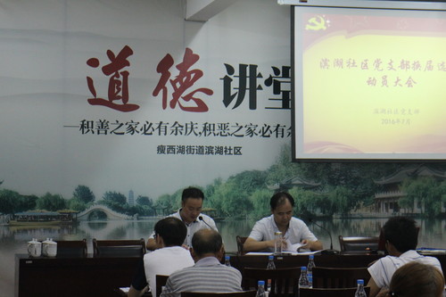 7月26日下午3点,冒着酷暑,滨湖社区党员相聚在了社区二楼会议室,参加瘦西湖街道滨湖社区党支部换届选举动员大会暨“两学一做”专题党课。