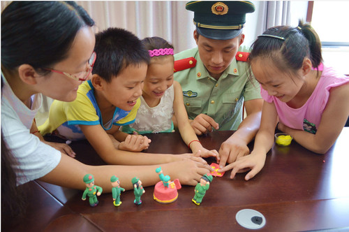 活动中,孩子们在武警战士和大学生志愿者的带领协助下,一个个军人造型从他们的小手中诞生。随着活动进行,孩子们和武警战士、志愿者们已经打成一片,配合默契愉快,从取泥到塑形再到上色,每一环节,孩子们都进行的十分认真仔细。