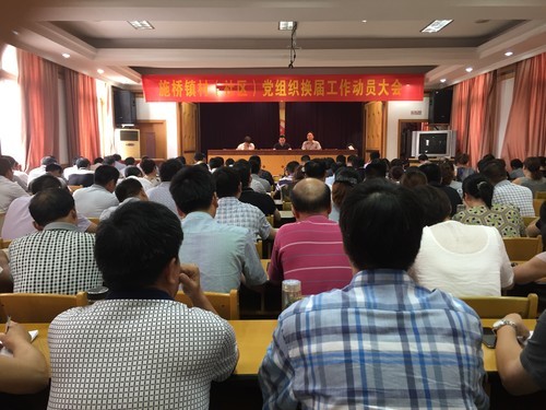 2016年8月5日下午,在完成前期初步调研考察的基础上,施桥镇在政府机关大会议室召开村(社区)党组织换届选举工作动员大会,全面部署村(社区)党组织换届选举工作。镇村(社区)党组织换届选举工作领导小组成员、各村(社区)党支部书记、第一书记、“两委”班子成员以及机关事业单位分工到村(社区)的全体人员出席会议。