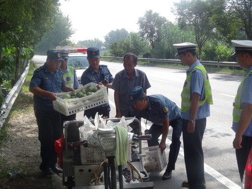 “大妈,你在路上叫卖不安全,万一被车子碰到了,你负主要责任,卖一个月的葡萄也赚不回医药费,我们帮你把这筐葡萄放上车,送你到附近的农贸市场去卖吧!”这是333省道高邮段路政、交警联手整治公路沿线流动水果摊的一个场景。