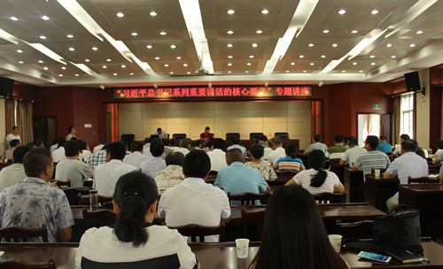 讲座中,田老师用翔实的数据、生动的语言、丰富的事例从习近平总书记系列重要讲话的问题意识、坚定不移走中国特色社会主义道路、坚持“五位一体”开展布局设计、加强和改善党的领导以及紧抓重要战略机遇期五个方面,深入剖析和诠释了习近平总书记系列重要讲话精神,让参会人员系统温习和领会了习总书记系列重要讲话的实质内涵和核心要义。