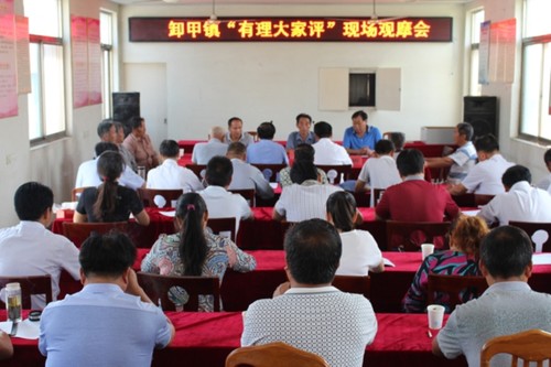 8月31日,卸甲镇结合”两学一做“学习教育,在大庵村举行了一次别开生面的“有理大家评”现场观摩活动,围绕“说群众话、让群众说”,劲推“有理大家评”社会管理新模式,新风尚。镇党委政法委员陈玉良参加相关活动。 活动现场,该镇大庵村两委会邀请镇法治调解员、村评议团成员对二组村民王某与赵某农田转包纠纷进行了现场评理调解。原来,村民王某去年秋季将5.25亩农田发包给本组村民赵某、在未签协议且对方未付租金情况下,王某要求调高租金遭拒,后想要收回农田迄今未果,他遂以此为由拖欠村里“两上交”……在听取当事人陈述后,镇法治调解员会同由老干部、老党员、村民代表组成的村评议团成员对当事双方各抒己见、进行“有理大家评”……经过1个多小时的依法说事、依规评理、现场调解,最终,村民王某与赵某基本达成共识,王某也交清了欠村里的“两上交”款1314元。 为不断强化基层民主法治建设,有效化解基层群众矛盾,卸甲镇对“有理大家评”向面上推广坚持“四个强化”“四个强化”即: 强化组织领导。镇里牵头司法、法治、综治、公安、宣传等部门成立“有理大家评”领导小组,各村(社区)明确聘选一批在群众中威望高、人缘熟、懂法律的老党员、“五老人员”、“两代表一委员”以及社会知名人士等组成评议团,村事顾问团开展评民、评官、评事、评理。 强化宣传引导。在以会代训、下发文件,现场观摩基础上,该镇会同各村(社区)充分运用各种宣传形式引导村民主动参与到“有理大家评”活动中来,争当弘扬真善美,批驳假丑恶的主人翁。从而为群众与群众之间、群众与政府之间搭建一个合理畅通的沟通平台,让有理者更正有理。无理者寸步难行。。 强化活动疏导。该镇明确将镇村(社区)多次调解未能解决的矛盾,有较大分岐的实事项目,征地拆迁纠纷,群众认为有疑惑的重大决策等列为“有理大家评”的重点内容。明确各村(社区)每月因地制宜开展2次以上“有理大家评”,从而形成独具特色的社会治理新机制。 强化考核督导。该镇把“有理大家评”工作纳入村(社区)综治工作重点,明确组织开展“有理大家评”活动的实施意见,并出台了具体考核细则,对评议团工作职责、评议范围、工作程序、工作要求和奖惩措施均明确了要求。 目前,卸甲镇”有理大家评”活动正不断升温。