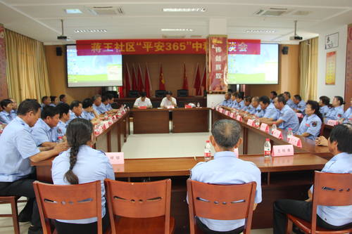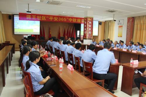 中秋节来临之际,在社区三楼会议室召开蒋王社区“平安365”中秋座谈会,来自社区49名老年义务巡逻队员参加了此次会议,蒋王社区为他们送上节日的祝福和慰问品。