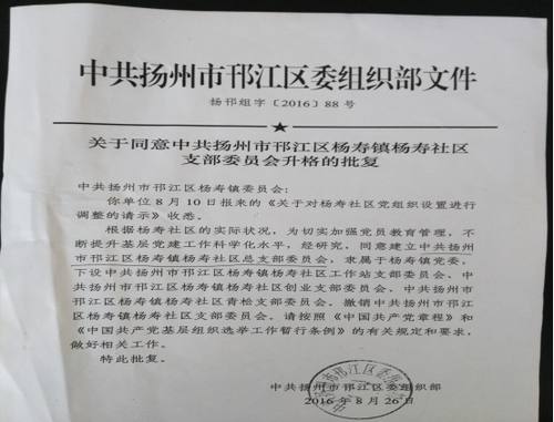 据了解,随着杨寿社区的不断发展,为进一步加强社区党员教育管理,增强党组织的凝聚力和战斗力,根据社区实际状况,杨寿社区党支部于2016年8月10日向区委组织部递交了《关于对杨寿社区党组织设置进行调整的请示》,并于8月26日获区委组织部批准。