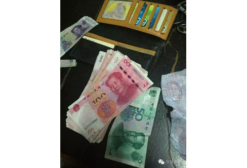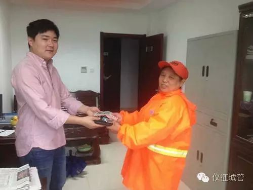 9月16日早上6点,环卫处四所保洁员高巧玲冒雨在东园北路格林豪泰酒店段清扫保洁时,发现人行道路边有一咖啡色钱包,因路上没有人,高巧玲打开钱包,发现钱包内有银行卡数张、现金数张,于是她保存好钱包并告知所长魏乃琴。魏乃琴将钱包内反映户籍为仪征市谢集村的身份证信息发给环卫处秦忠主任,秦忠最终通过110与失主联系上。