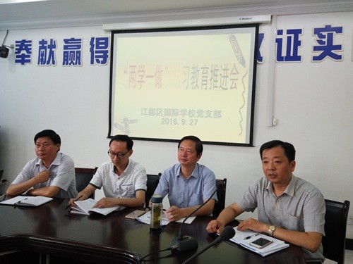 9月27日,区教育工委副书记教育局副局长张晋、陈世进科长检查了国际学校支部“两学一做”学习教育的台账和个人学习笔记,并参加了学校支部举行的“两学一做”学习教育推进会。在会上支部汇报了前期学习的10项重点活动和8项个人学习的要求,有4位党员教师做了代表发言,吴庆堂校长对学校“两学一做”工作提出五带头,即带头遵守法规校纪、带头服从分工,带头钻研业务,带头干好本职工作,带头爱护学生。最后张晋副局长对国际学校“两学一做”学习教育的前期工作给予了充分肯定,并提出当前要做到“四强化”,强化党性意识,强化学习意识,强化责任意思,强化纪律意识。
