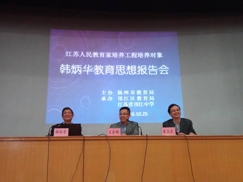 10月25日下午两点,省教育厅、省教育科学研究院组织,扬州市教育局主办、邗江区教育局和江苏省邗江中学承办的“江苏人民教育家培养工程”第二期培养对象韩炳华教育思想报告会在江苏省邗江中学多功能报告厅举行。报告会由市教育局“教师培训中心”束玉良主任主持,省教育科学研究院基础教育研究所王彦明博士和束玉良主任做了点评,他们称赞韩老师的思想报告具有“教育文化的宽厚性、学科理解的深刻性、教育价值的现代性和教学实践的操作性”。邗江区教育局钱文捷副局长和来自于全市各地中学英语教研员、中学英语名师工作室成员、中小学英语骨干教师代表近400人参加了报告会。