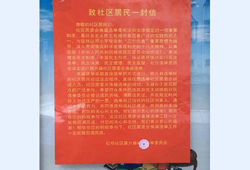 为了更好的完成人大、居委会换届选举的宣传发动及选民登记工作,11月8日开始,虹桥社区以网格为单位,责任到人,宣传到户,在辖区内及时利用社区宣传橱窗、横幅、LED电子屏进行换届选举宣传,并在辖区小区、企业单位门口张贴人民代表大会换届选举公告、及致社区居民的一封信。社区工作人员还采取入户上门跟居民面对面宣传的方式,向居民宣传普及人大换届选举工作开展的重要性。