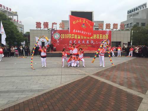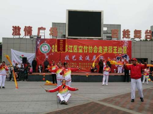 “孔雀开屏”、“金龙盘柱”、“回头望月”、“高山流水”、“蚂蚁上树”等十几个空竹绝活轮番上演,上下翻飞的彩色空竹吸引了上百居民鼓掌欢呼……,11月10上午,邗江区空竹协会技艺交流展演在蒋王社区百姓广场举办。