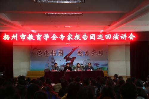 11月18日,扬州市教育学会专家报告团巡回演讲会走进江都区仙龙川小学。活动由扬州市教育学会秘书长薛大威主持,扬州市教育学会余如进会长、江都区教育局朱其山局长到会分别发表了重要讲话。来自我区各学校的400余名教师参与了本次活动。