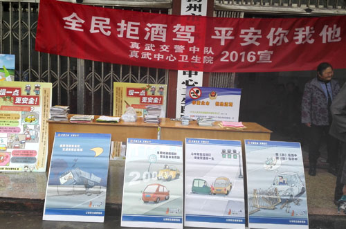 11月18日上午,真武中心卫生院和真武交警中队在真武社区通过悬挂宣传横幅、设置宣传展板、发放宣传资料等形式向过住的群众宣讲酒后驾车事故案例、宣传“酒驾入刑”的标准,积极倡导“珍爱生命拒绝酒驾”,共同营造良好的交通环境。