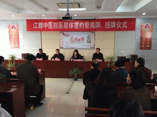 11月25日, 在宜陵中心卫生院举行了扬州市江都中医院医联体签约及授牌仪式。区卫计委副主任刘兴兵、办公室主任顾辉、中医院全体领导、11家基层医疗机构单位负责人出席了签约、授牌仪式。 江都中医院是一所学科齐全、中医特色明显、专科优势突出的综合性二级甲等中医医院,是全区中医药工作龙头单位,也是“江苏省中医院协作单位”、“扬州市中医院医联体”医院。医院人才储备充分,拥有博士、硕士17名,“扬州市名老中医”和“江苏省农村优秀中医临床人才”7名;专科特色明显,拥有省级重点专科建设单位1个,扬州市级重点专科4个,“许氏骨伤”、“张氏眼科”、“郑氏中医”等一大批专科在本地享有盛誉。