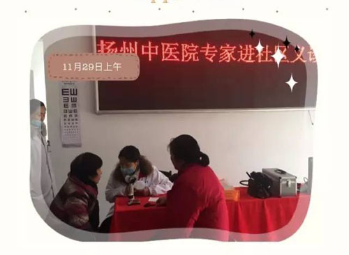 为积极普及医疗卫生知识,倡导健康的生活方式,提高百姓的健康水平和生活质量,11月29日上午,施桥镇六圩社区邀请扬州市慈善总会和扬州市中医院走进社区开展“光明梦”公益活动,免费为群众测量视力、检测白内障、测量血压等。义诊活动现场,医生详细询问群众的病情,认真检查、诊断,耐心解答群众提出的各种问题,对百姓的日常保健进行宣传教育。活动中还充分发挥中医诊疗特色,对群众就中医养生、中医保健等方面问题进行答疑解惑,受到群众的热烈欢迎。
