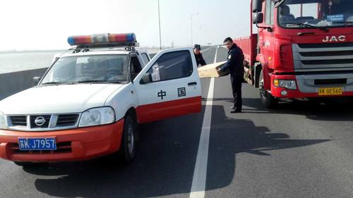 这辆路政车是高邮市公路路政大队湖西中队的巡查车。巡查至该处,车上的路政人员发现了路上的空调机组,判定是前面的装运车辆掉落下来的,立即下车,将空调机组搬上车驱车追赶,一直开了近20公里,才追上大货车,司机蒙在鼓里,还不知道掉落。经检查,因包装厚实,掉落的空调机组没有摔坏。随后路政人员又帮助司机将空调机组搬上车,并捆绑牢固,货车司机感动不已。