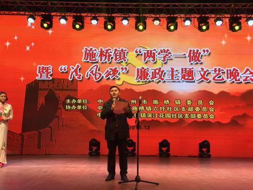 为了扎实推进“两学一做”学习教育和施桥廉政文化建设,全面落实管党治党责任和推进全面从严治党,2016年12月16日,施桥镇在镇文化中心大礼堂举办了一场主题为“清风正气铸和谐、廉洁奉公情为民”的廉政文艺晚会。全镇机关、事业单位、各村(社区)党员及部分居民群众800多人观看了演出。