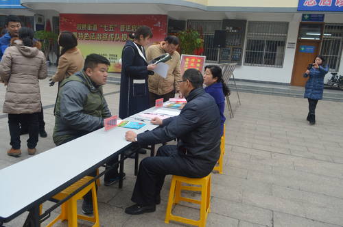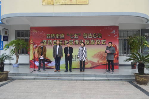 12月22日上午, 双桥街道“七五”普法启动暨特色法治宣传队授旗仪式在虹桥社区隆重举行。邗江区司法局副局长潘长江、综治办副主任叶莉、双桥街道党工委书记黄金发、党工委副书记杨福琪出席活动。各社区书记、主任、大学生村官及扬大社会发展学院志愿者近100人参与活动。