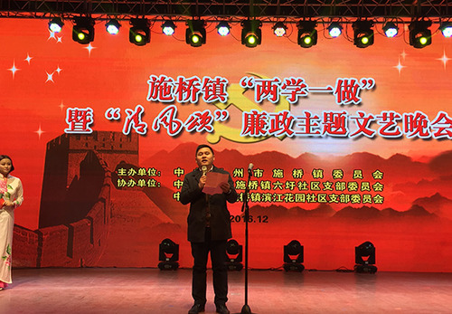为了扎实推进“两学一做”学习教育和施桥廉政文化建设,全面落实管党治党责任和推进全面从严治党,2016年12月16日,施桥镇在镇文化中心大礼堂举办了一场主题为“清风正气铸和谐、廉洁奉公情为民”的廉政文艺晚会。全镇机关、事业单位、各村(社区)党员及部分居民群众800多人观看了演出。 本场晚会由施桥镇党委主办、六圩社区党支部和滨江花园社区党支部协办,大多数节目都是由施桥的机关事业单位职工及本土群众艺术团体自编自导自演,同时邀请了汪明、杨明坤、赵紫君等省、市曲艺名家前来献艺,整个活动贯穿了“爱国、清廉、为民”的主线,得到广大党员群众的褒奖和好评。镇党委书记李冬同志在晚会上致辞,他指出:此次廉政晚会的举办是我镇对腐败零容忍态度的一种表达,更是为了在全镇营造一种风清气正的蔚蓝天空。在今年大换届的背景下,新的班子新的队伍必须要顺应广大党员群众对廉洁政府和廉洁干部队伍的期盼。他号召大家一起争做对党忠诚、做事干净、勇于担当的好干部,以坚定的信仰、务实的作风、为民的情怀当好人民的公仆,真心实意地为施桥的老百姓谋福祉、为开发区的发展做奉献,共同推进全镇廉政建设和反腐败工作取得新成效、迈上新台阶