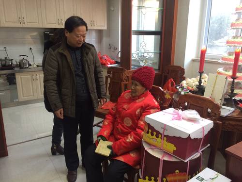 为弘扬养老、爱老、敬老风气,蒋王社区居委会为辖区高寿老人发放尊敬老金,凡老人年龄达到80岁,在老人80岁生日当天送去尊老金500元,蛋糕一盒。老人年龄达到90岁,在老人90岁生日当天送去尊老金1000元,蛋糕一盒。老人年龄达到100岁,在老人100岁生日当天送去尊老金5000元,送戏一场4000元,蛋糕一盒。12月27日,社区居委会主任晏智荣来到汇祥苑90岁老人伟桂英家中,共同为伟桂英老人庆祝90岁生日,送上党和政府的关怀与温暖。