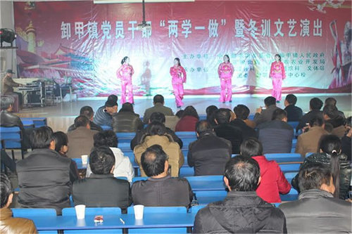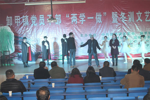 元月3日下午,为期5天的卸甲镇2016—2017年度党员干部冬训班闭幕,作为此次冬训的“压轴大戏”——卸甲镇党员干部“两学一做”暨冬训文艺演出在卸甲小学报告厅隆重上演。参训的数百名党员干部享受了一道别具浓厚地方特色的精神文化大餐。 此次由卸甲镇党委政府主办,镇宣传科、组织科、纪委、文体站等承办的党员干部“两学一做”暨冬训文艺演出,以贯彻党的十八届六中全会、省、扬州、高邮党代会和高邮市委十一届二次全会精神,强化责任谋发展,共建“三园四镇”新卸甲为创作主线。整场节目中有自编音乐快板《‘两学一做’明方向卸甲明天更辉煌》,反腐倡廉小品《迟到的忏悔》,有讴歌身边典型——全国巾帼创业女能手薛巧云的原创歌曲《水乡巧妹子》,根据真人真事编排的歌舞情景剧《新型农民点子多》,更有展现卸甲人真善美与幸福小康生活的励志小品 《妈妈,你哪里》、肩担木偶戏《新农夫与蛇》等,整场演出好戏连台,掌声不断,从而传递了正能量。。 演出前,卸甲镇参训党员干部还集中观看了《激情跨越谱新篇——卸甲镇2016年经济社会发展暨‘两学一做’学习教育回眸》专题片。据了解,演出结束后,该镇将组织人员赴八桥、伯勤、龙奔等片区送“两学一做”文艺节目进村、进社区巡演。