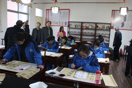 在公道中学沈文涛校长的指引下,省课程基地视导调研组领导专家及市区教育局的相关领导一行10人,首先实地考察了公道中学艺术部的教育教学设施,他们参观了学生绘画室、“扬州画派”体验馆、师生优秀书画作品展览室、学生美术作品展、校园文化墙,领导专家一行还零距离的接触到扬州非遗大师指导的:剪纸、篆刻、瓷刻、刺绣等社团活动,与非遗大师及社团学生进行了简短的沟通交流。
