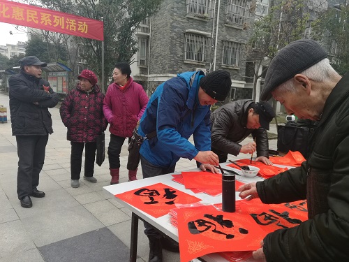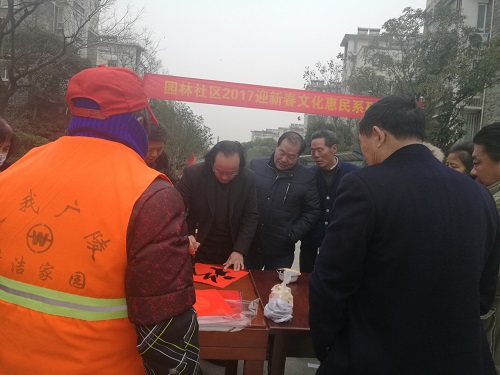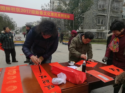 在冬日的寒风中,园林社区书法协会的书法家们不畏严寒,在社区领导的安排下,在小区广场、现场为居民们免费写对联、写福字近两个小时,居民们在家们口就领到了自己想要的对联和福字,一个个开心得合不拢嘴。