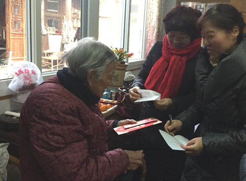 广陵区民政局和街道、社区相关工作人员来到老人家中,为她送上了生日祝福和慰问金。工作人员拉着老人的手问:“您老身体可好?”“好,好,好!”精神矍铄的孙奶奶乐呵呵地回答。工作人员对老人饮食起居、身体状况都问得十分仔细,和老人子女谈起母亲的高寿时,说除了有规律的生活、有家人的陪伴、有良好的生活环境,更离不开党和政府的好政策。