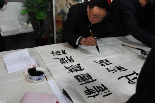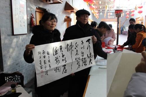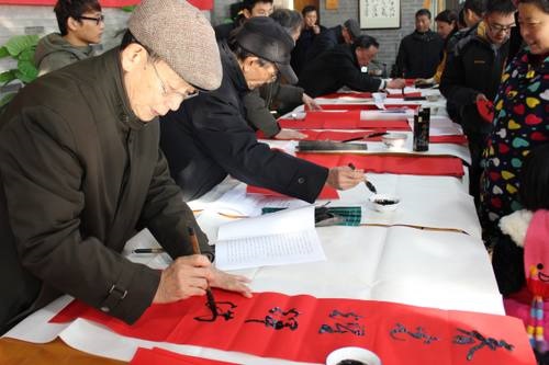 尽管天气寒冷,但丝毫没有到影响大家的热情,活动现场围满了前来领取春联的党员群众。书法家们挥毫泼墨,一幅幅精彩的书法作品,一句句吉祥如意的春联,为即将来临的春节增添了浓浓的喜庆氛围。春联写出了群众的心声,写到了群众心坎上,领到老书画家们现场书写的春联的村民们脸上洋溢着幸福的笑容。