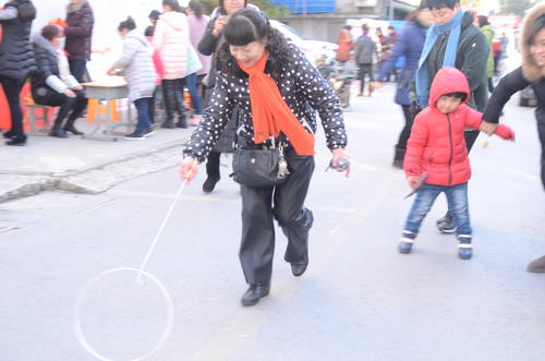 活动主要有怀旧游戏大比拼、民俗文化展示两大板块,整场活动紧扣“回忆、传承”的主题。由于活动经过前期宣传,在活动尚未开始前,社区居民便都早早的来到活动场地耐心的等待,老人们心怀期待,孩子们刚放寒假,离开了作业的束缚,像脱缰的野马一样在场地上追逐玩闹,在活动主持人宣布开始后,大家便踊跃报名,纷纷参加了滚铁环、抽陀螺、弹瓶盖、投沙包、跳房子等富有童趣的小游戏。瞧!这位回族大爷挥舞着鞭子,旋转的陀螺像只跳动的精灵在地面上翩翩起舞,一边的小孙子跳着喊道:“爷爷,你太牛了!”玩着滚铁环的老人们也不甘示弱,手里提着铁杆,操动着铁环在地面上快速的滚动,大家跑动着,吆喝着,个个老当益壮,“老小孩们”脸上洋溢着灿烂的笑容,一个个重新装满回忆的沙漏,相互诉说炫耀着当初自己对此游戏项目是如何厉害。当然也有许多年青人对此游戏项目较为陌生,他们便多猜起了一边廉政、年俗等类的灯谜。