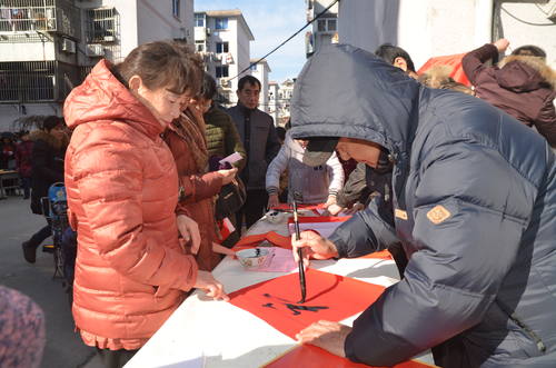 “爆竹声中一岁除,春风送暖入屠苏。千门万户曈曈日,总把新桃换旧符。”写春联、贴春联是我国优秀传统文化,老年书法爱好者为在场的社区居民挥墨迎新春,“一帆风顺年年好,万事如意步步高”、“春回大地,福满人间”等耳熟能详的对联与书法爱好者磅礴大气的书法交相辉映,居民们围在书法爱好者身边,在观摩等待春联、福字的同时,也纷纷赞叹着“字写的真好!”一位侨眷书法爱好者,本身是位机关退休干部,在活动最后,用意颇深的专门写了几幅廉政对联赠予社区。
