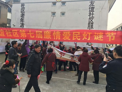 这是春节后的首个节日:元宵节!友谊社区在社区健身广场举办了“友谊社区第七届廉情爱民灯谜节”活动。从2月6日开始,社区的工作人员和党员志愿者们就开始对活动现场的道具进行购买、布置,写灯谜,挂灯谜,准备好抽奖所需的奖品和小礼品等等。9日下午三点,活动正式开始。300多条关于廉政、人文、低碳等相关知识的融入从而丰富了灯谜更深层次的意义。30余份热气腾腾的汤圆亦随着社区工作人员和党员志愿者的脚步走进了的困难家庭、低保户、劳模家庭、现役军人家庭以及革命伤残军人家庭。给大家带来廉政的新风、亲民的意愿,祝福大家新的一年生活甜美、幸福圆满。