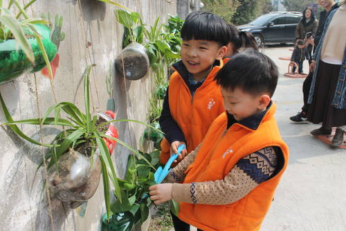 活动中,小朋友们把家里的废旧的塑料瓶带到社区,和社区志愿者哥哥姐姐们一起种植上绿色的植物,系上麻绳,贴上自己的班级和姓名,以不同方式,错落有致的悬挂在老小区破旧的墙面上,一是起到美化污墙的作用,二是将废旧的垃圾转变为装饰社区环境、美化的社区污墙的宝贝;小朋友们看到自己的劳动成果得到了老师和社区居民的点赞后,个个欣喜若狂、手舞足蹈,用稚嫩的嗓音说:我们会每天来这儿给它们浇水的,另外社区还给每位小朋友发放了致家长的一封信,告诉小朋友回去要跟爸爸妈妈、爷爷奶奶一起美化环境,爱护环境。